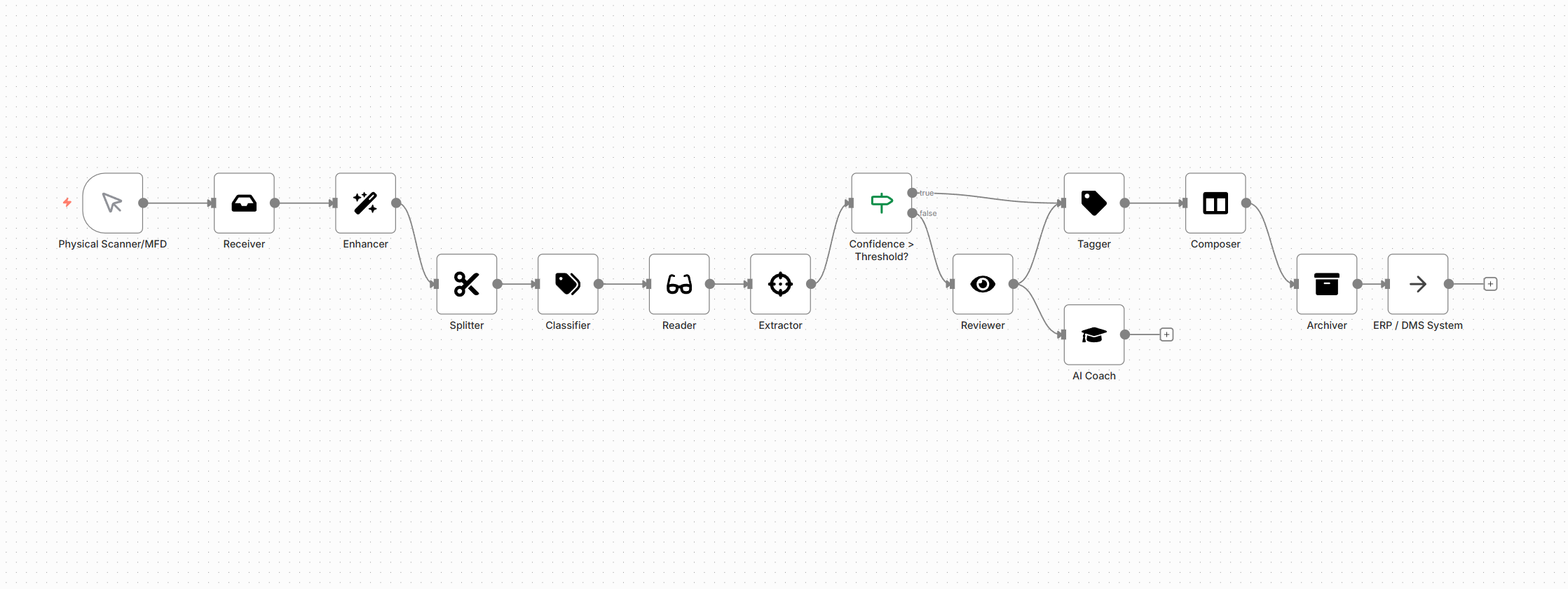 The workflow begins the moment batches are captured by scanners or MFDs, and each step is handled by specialized nodes that collaboratively deliver clean images, accurate interpretations, and reliable indexing.
